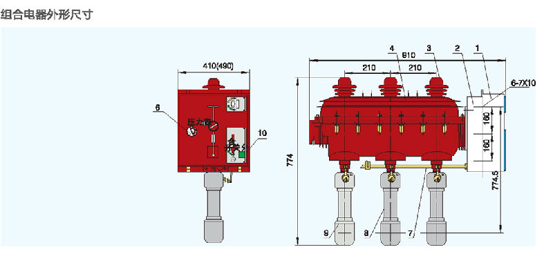 1、機(jī)構(gòu)S 2,機(jī)構(gòu) 3、上接線端屏蔽 4、負(fù)荷開關(guān)本體 5、下接線埔屏蔽或熔斷鼉上觸頭座 6、SF6壓力表 7、摧擊脫扣系統(tǒng)
